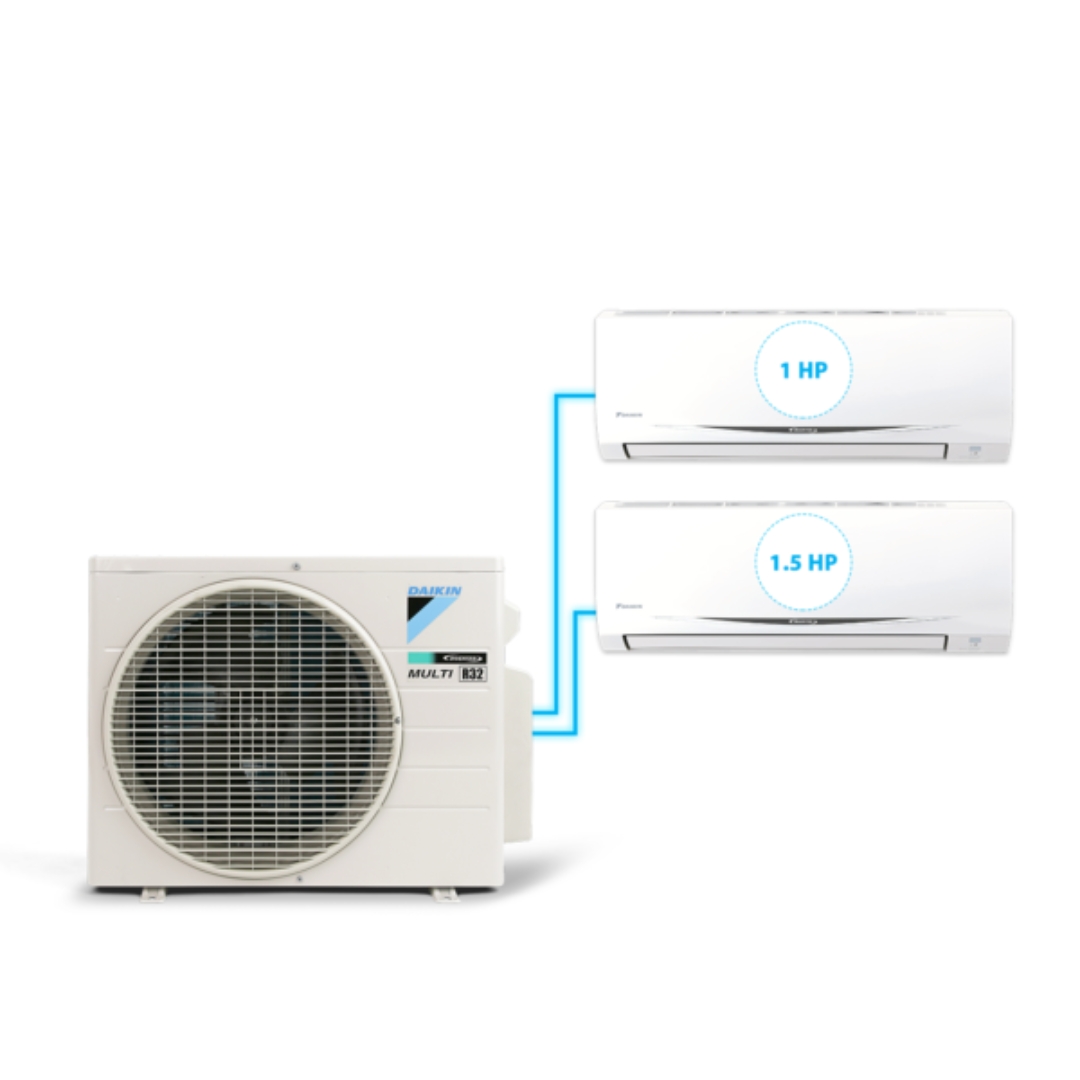 Máy điều hoà multi 1 nóng 2 lạnh là máy điều hòa không khí với máy nén đơn (dàn nóng đơn) có thể kết nối với nhiều dàn lạnh. Hệ thống hoàn hảo dành cho các loại nhà nhỏ với không gian lắp đặt dàn nóng hạn chế như chung cư, trả lại không gian ban công cho người sử dụng. Bằng cách giảm số lượng dàn nóng, hệ thống điều hòa không khí Multi cũng góp phần làm giảm độ ồn cùng với việc đi dây điện quá nhiều và nhiệt thải tích tụ gây ra hiện tượng quẩn gió cho hệ thống.
