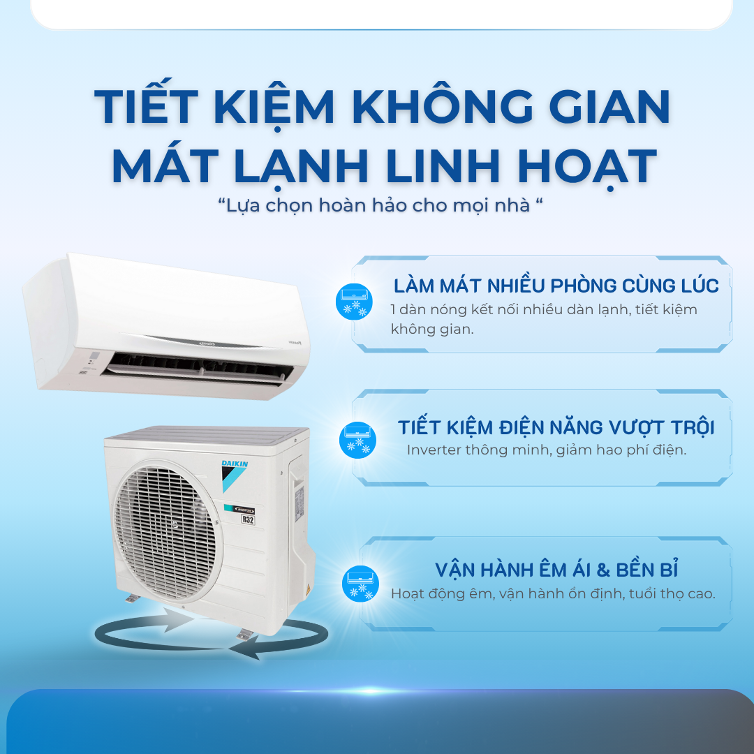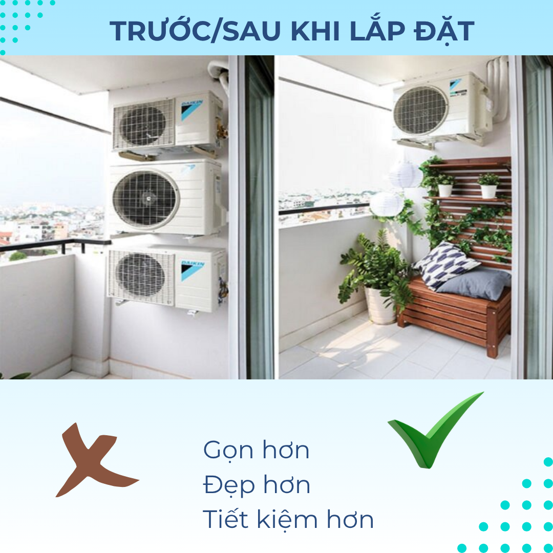 Do các căn hộ nhỏ hoặc chung cư có không gian khá hạn chế cho việc lắp đặt nhiều dàn nóng, Ngoài ra, khi các dàn lạnh được lắp đặt gần với nhau mà không đủ không gian tản nhiệt, hiện tượng quẩn gió có thể xảy ra, ảnh hưởng đển công suất làm lạnh, làm giảm hiệu suất và độ bền của máy điều hòa. Multi S cho phép kết nối 3 dàn lạnh vào 1 dàn nóng, giúp tránh được tình trạng quẩn gió, tăng hiệu suất làm lạnh và độ bền của máy.